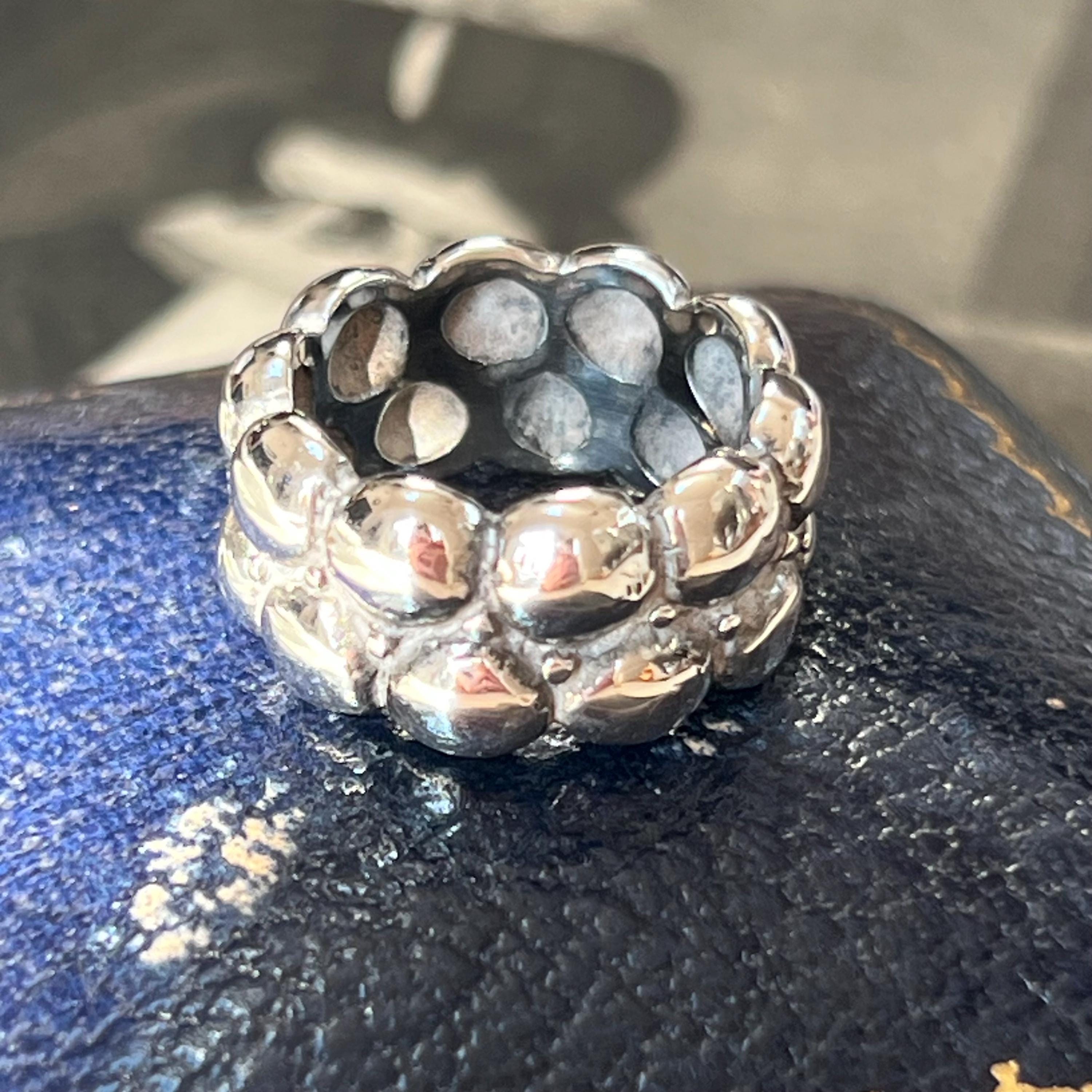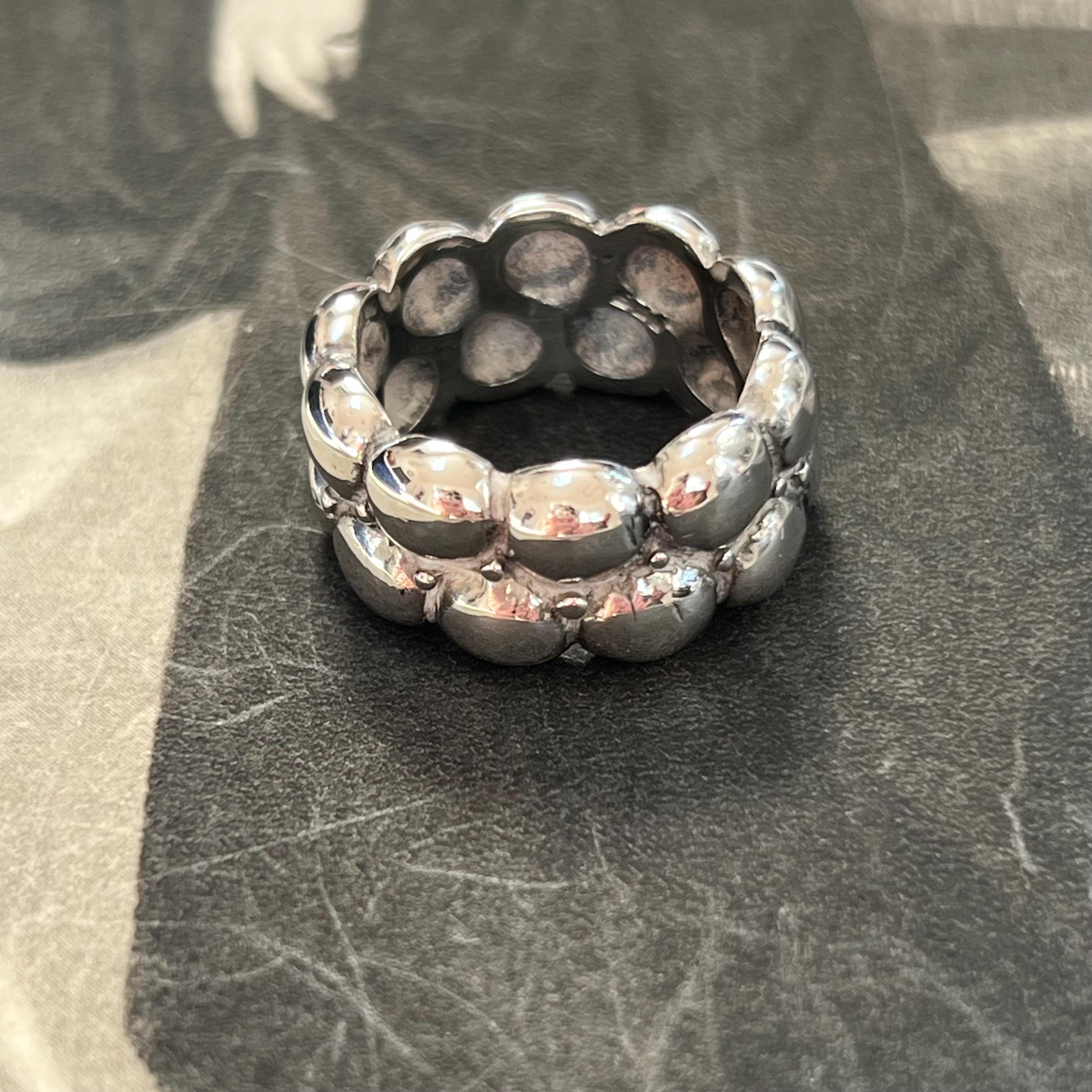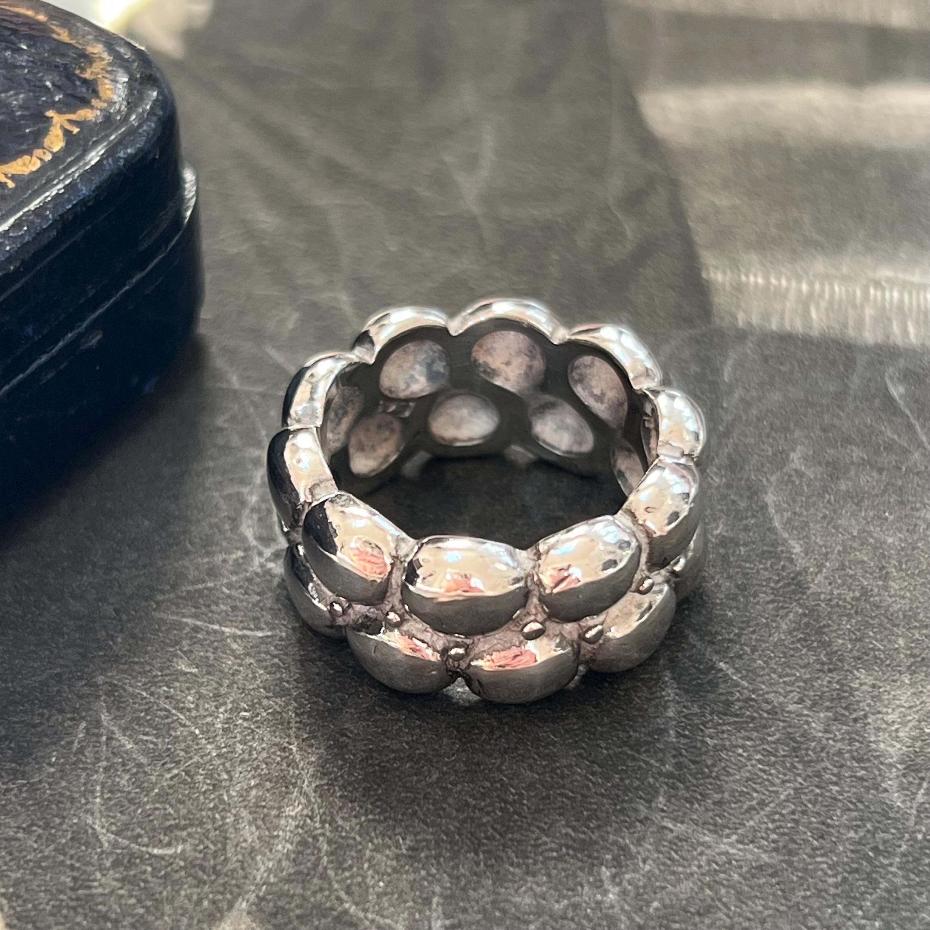 Bold vintage 1990s solid silver ring featuring a striking brutalist bubble design, formed from two rows of rounded dome details across a wide band.