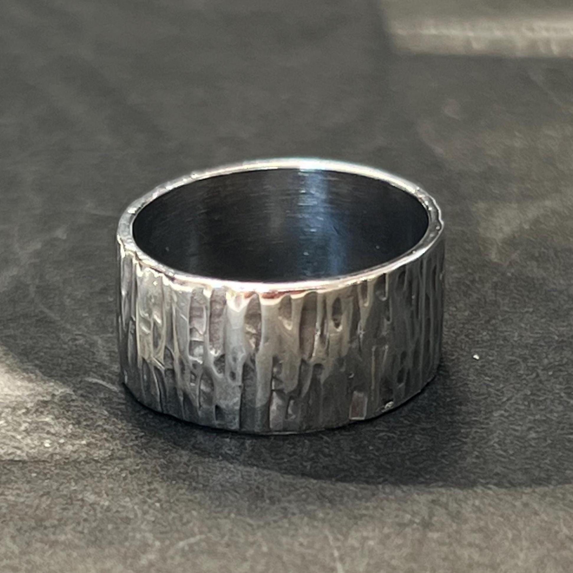 Stylish vintage Scandinavian modernist ring by Nina Breddal - circa to the 1970s. Crafted in solid 925S silver, this wide band features a beautifully textured surface, giving it a distinctive organic and contemporary feel. A versatile piece that works equally well as a modernist statement ring or a unique wedding band. Stamped “925S” (Scandinavian silver standard) and “N B” for Nina Breddal to the inside of the band.